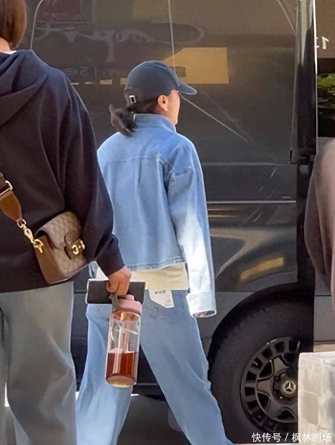 她一稔一件浅蓝色牛仔服套装,头上戴着浅蓝色帽子,网友只持拍到她的一个背影。